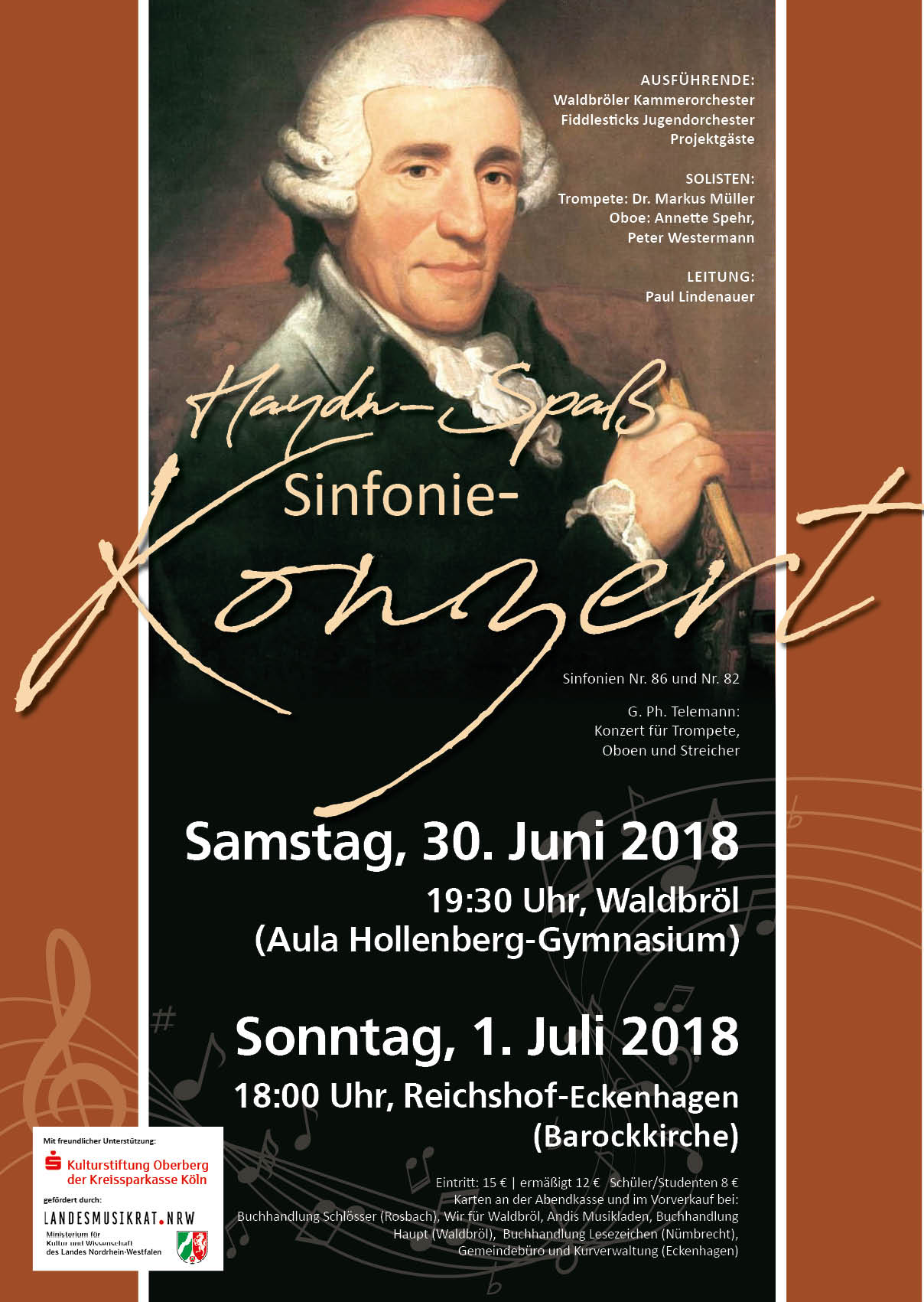 Unter dem Motto „Ein Haydn-Spaß“ spielen das Waldbröler Kammerorchester, das Jugendorchester „Fiddlesticks“ und eine Menge weiterer begeisterter Amateure aus der Region unter meiner Leitung zwei sinfonische Konzerte mit großartiger Musik von Joseph Haydn. Zur Aufführung gelangen die Sinfonie Nr. 82 mit dem Beinamen „Der Bär“ und die Sinfonie Nr. 86, die unter Kennern als eine der schönsten und bedeutendsten Sinfonien überhaupt gilt. Für diesen „Haydn-Spaß“ konnten namhafte Solisten gewonnen werden, Dr. Markus Müller (Trompete) und Annette Spehr und Peter Westermann (Oboen). Um die professionellen Gäste einmal herauszustellen und auch um den im Orchester zwar bedeutenden aber meist weniger im Vordergrund stehenden Instrumenten einen solistischen Platz einzuräumen, wird außer den beiden Haydn-Sinfonien das Konzert für Trompete, Oboen und Streicher von Georg Ph. Telemann geboten.